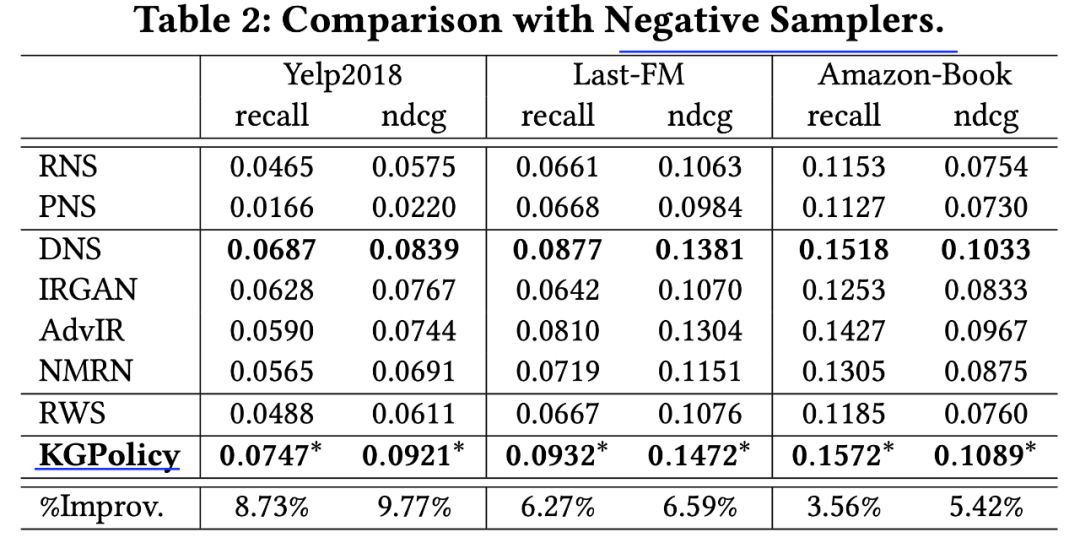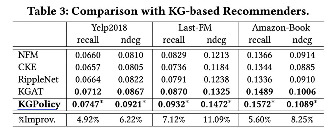 将矩阵分解跟KGPolicy结合后,相对STOA采样方法(比如DNS和IRGAN)和利用知识图谱强化的推荐模型(如KGAT)取得了显著提升。