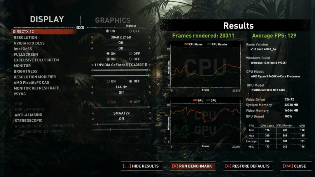 从截图可以看出,运行《赛博朋克2077》时,在 4K 分辨率、极致光追、DLSS 自动的设置下,平均帧数为 82 帧,最高帧数 111 帧,最低帧数 52 帧。在把分辨率降为 2K,其它设置不变的情况下,平均帧数为 116 帧,最高 151 帧。