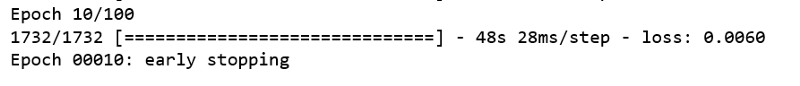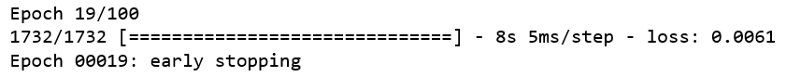 history_lstm_model = lstm_model.fit(X_train_lmse, y_train, epochs=100, batch_size=1, verbose=1, shuffle=False, callbacks=[early_stop])