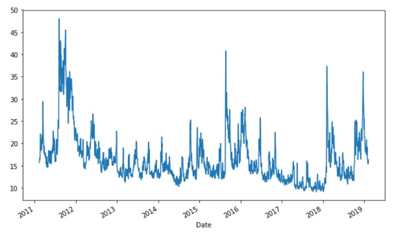 可以从这里(https://ca.finance.yahoo.com/quote/%5Evix/history?ltr=1)下载波动性标准普尔500数据集,时间范围是:2011年2月11日至2019年2月11日。我的目标是采用ANN和LSTM来预测波动性标准普尔500时间序列。