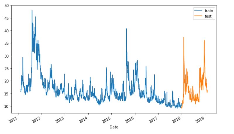 按日期“2018–01–01”将数据拆分为训练集和测试集,即在此日期之前的数据是训练数据,此之后的数据是测试数据,我们再次将其可视化。