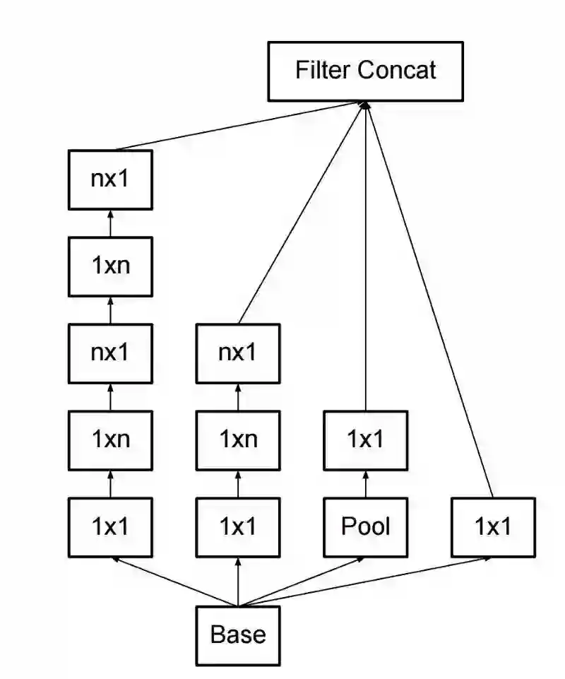 过滤器通过卷积压缩精简也能被分解进入更为复杂的模块,如图所示: