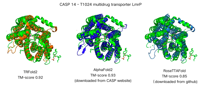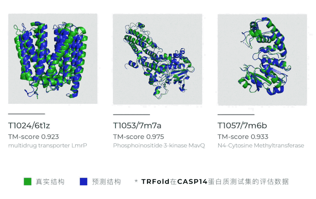 图示:对于单个蛋白的预测,TRFold 已经可以得到与 AlphaFold2 相媲美的结果。