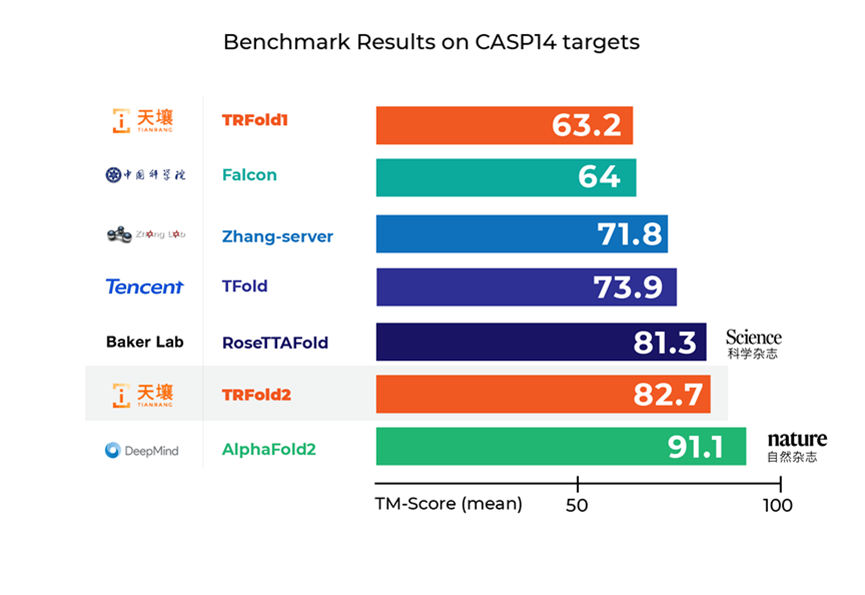 日前,来自中国上海的天壤 XLab 团队,其自研的蛋白质结构计算平台TRFold2,在基于国际权威的CASP14蛋白质测试集的评估中获得82.7的成绩(满分100),超过华盛顿大学生物学家 David Baker 团队研发的 RoseTTAFold,仅次于AlphaFold2。