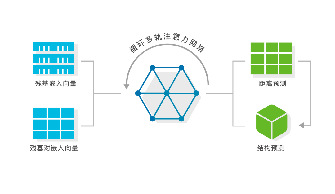 图示:TRFold 采用 5000万的参数循环多轨注意力网络,同时支持氨基酸的距离预测和结构预测。