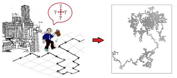 想象在曼哈顿东西南北格点化的街道中有一个小醉汉,他每次到达一个交叉路口时都会随机选择前后左右四个方向其中的一个,然后继续前进(或后退);在走到下一个路口时又随机选择一次方向……如此继续下去,他所经过的路径会具有什么样的特点呢?