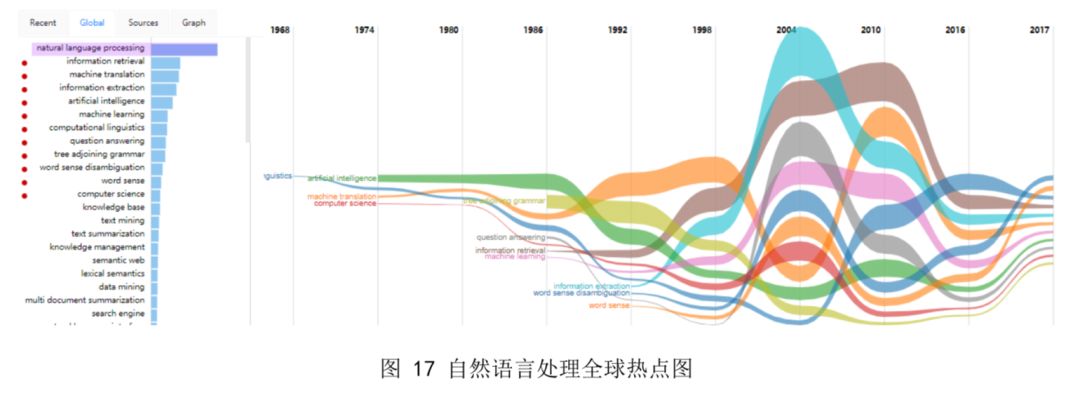 下图分别是 AMiner 计算出的自然语言处理近期热点和全球热点。通过对 1994-2017 年间自然语言处理领域有关论文的挖掘,总结出二十多年来,自然语言处理的领域关键词主要集中在计算机语言、神经网络、情感分析、机器翻译、词义消歧、信息提取、知识库和文本 分析等领域。旨在基于历史的科研成果数据的基础上,对自然语言处理热度甚至发展趋势进行研究。图中,每个彩色分支表示一个关键词领域,其宽度表示该关键词的研究热度,各关键词在每一年份(纵轴)的位置是按照这一时间点上所有关键词的热度高低进行排序。