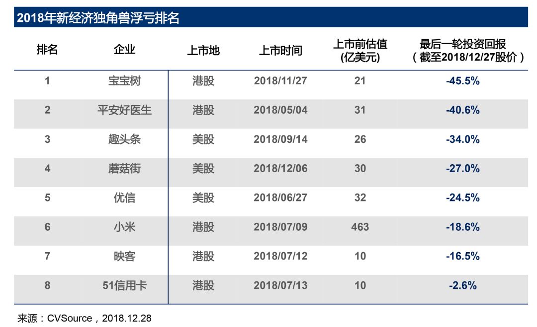 而一二级市场价格倒挂的反噬已经在一级市场体现得淋漓尽致,数据显示,2018年上市的几个主要的独角兽公司,最后一轮进入的一级市场投资者都处于持续“失血”状态。