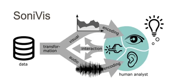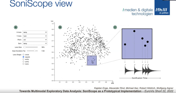 随后,Aigner教授介绍了当前最新的项目 SoniVis (如图7所示)。SoniVis 旨在结合数据的声音表现形式 (audio representation) 和视觉表现形式 (visual representation),利用视觉和听觉的双重感知通道来编码数据,从而增强用户对数据的理解和分析能力。基于D3.js,Aigner教授团队在jupyter notebook中创建原型-SoniScope (如图8所示)。界面分为ABC三个部分。在A区域,用户可在界面内自定义数据的映射方式,如坐标轴的映射方式,音调的映射方式,排序时基于的变量等。同时用户可对数据选择框的形状和大小进行自定义的调整。B 区域将数据以点云形式进行可视化,为用户提供数据选择操作的交互界面。C区域展示被选中数据的音频可视化。Aigner教授随后通过对系统的详细展示,向观众生动地诠释了视觉通道的与听觉通道的结合后对数据分析的意义。用户可通过播放选中区域内所有基于数据属性映射而形成的声音集合来比较两块区域的总体数值大小以及分布情况,在这种情况下,听觉通道对视觉通道进行信息补充,增加了用户在单位时间内接收到的信息类别和数量,极大程度上加强了用户对数据的理解能力。之后,Aigner教授介绍了 Audio-visual Analytics Community (https://audio-visual-analytics.github.io/)。