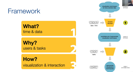 随后,Aigner教授给出了为时间数据选择适当的可视化技术的一般框架。该框架包括三个部分:第一步"What“:找出什么是可视化的时间数据,并且发现对应的特征;第二步"Why":明确为什么要用可视化方法,即确定目标用户与任务;第三步"How":确定怎样进行可视化,包括使用的可视化技术、交互等。
