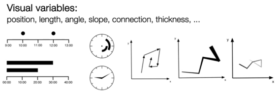 How:第三步Aigner教授讲解了怎样可视化,以及我们如何为时间数据选择交互技术。时间数据的表示主要有两种方式:1)用动画这种动态的形式将时间数据与真实的时间对应。它往往更容易理解,但缺难以直接对比两个时间点。2)静态的方式会使用其中一个维度表示时间,即将时间编码到空间上。存在一些可视化的变量可以编码时间数据,例如位置、长度、角度、斜率、连接、粗细、透明度等等 (如图5所示)。Aigner教授介绍了一个他们的项目 (browser.timeviz.net),可以通过输入时间特征、数据特征,找到合适的可视化技术。