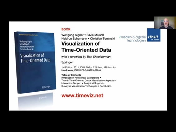 Aigner教授目前已发表一本关于时间数据的专著,《Visualization of Time-Oriented Data》(http://www.timeviz.net/),同时建立了一个时间可视化合集网站 (http://www.timeviz.net/),方便相关爱好者学者学习以及借鉴。