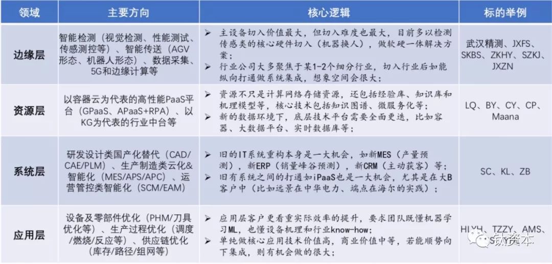 前面分析流程工业在智能化各个阶段的发展要素,接下来把工业智能投资分为四层: