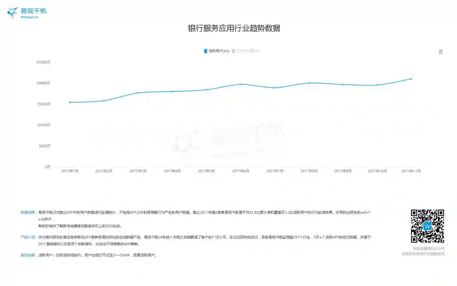 2017年11月,由于网络购物、营销活动力度加大等因素影响,银行服务应用APP活跃用户普遍上涨。根据易观千帆最新数据显示,2017年11月,银行服务应用领域活跃用户达21040.7万户,环比增长7.52%。