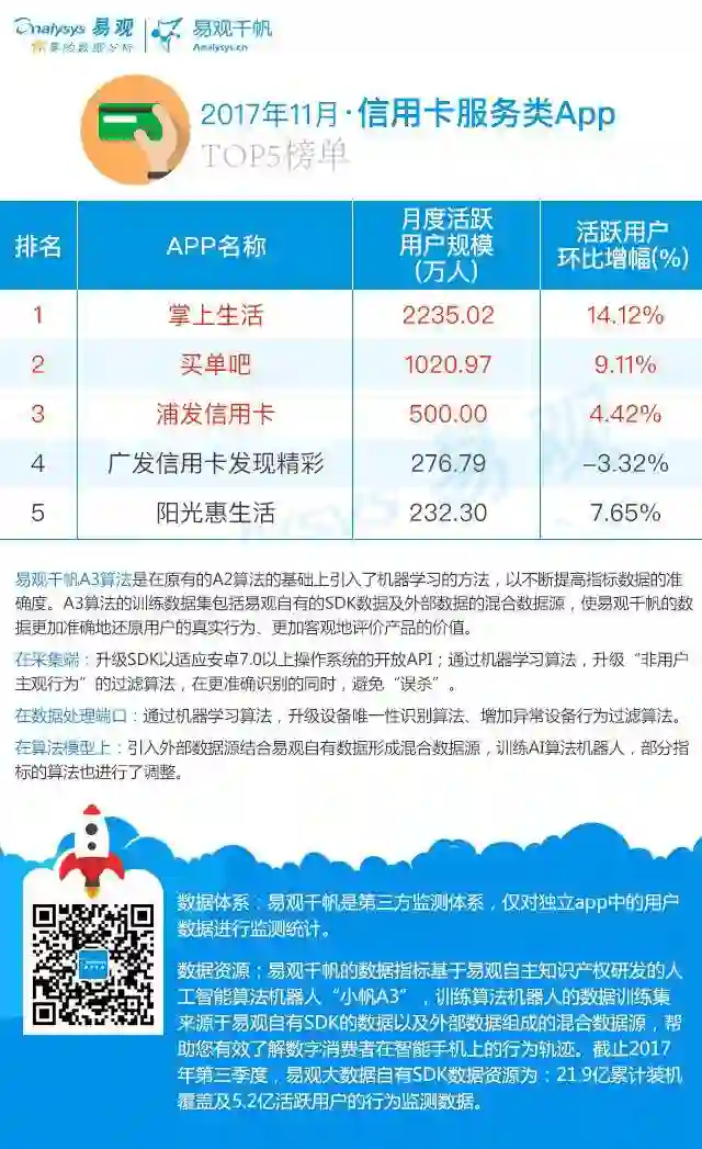 根据易观发布的2017年11月信用卡TOP5榜单显示,掌上生活、买单吧、浦发信用卡分别以2235.02万、1020.97万、500.00万的活跃用户位列前三甲。