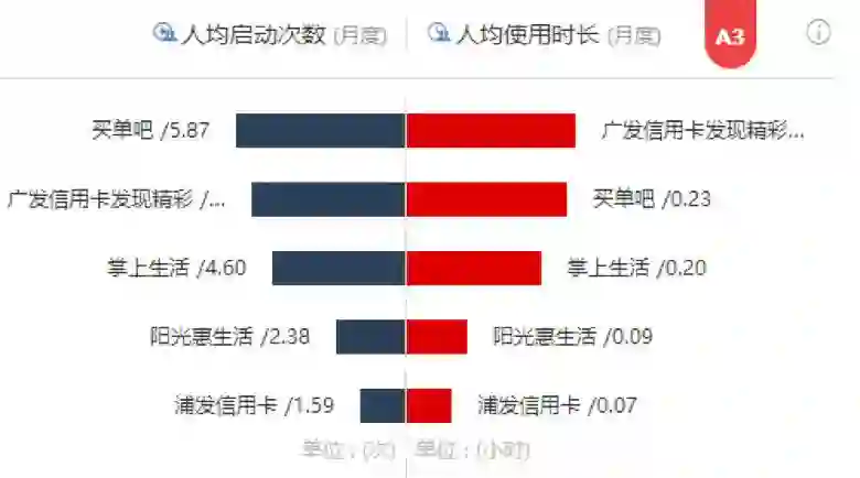 从人均数据来看,交通银行“买单吧”、广发信用卡发现精彩优于招商银行“掌上生活”。“买单吧”人均启动次数和人均使用时长分别为5.87次和0.23小时、广发信用卡发现精彩人均启动次数和人均使用时长分别为5.33次和0.25小时。