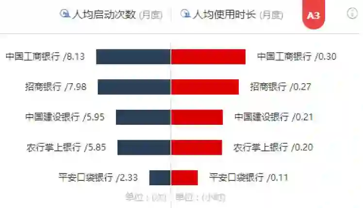 从人均数据来看,中国工商银行和招商银行表现较优,用户粘性较大。中国工商银行人均启动次数和人均使用时长分别为8.13次和0.30小时,招商银行人均启动次数和人均使用时长分别为7.98次和0.27小时。