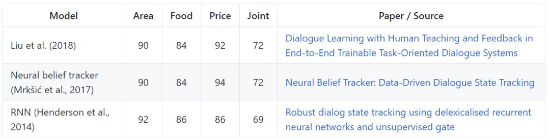 对于目标导向的对话,第二对话状态追踪挑战赛(Second dialog state tracking challenge,DSTSC2)的数据集是一个常用的评估数据集。对话状态追踪涉及确定在对话的每个回合用户在当前对话点的目标的完整表征,其包含了一个目标约束、一系列请求机会(requested slot)和用户的对话行为。DSTC2 聚焦于餐厅搜索领域。模型基于单独的和联合的机会追踪的准确率进行评估。