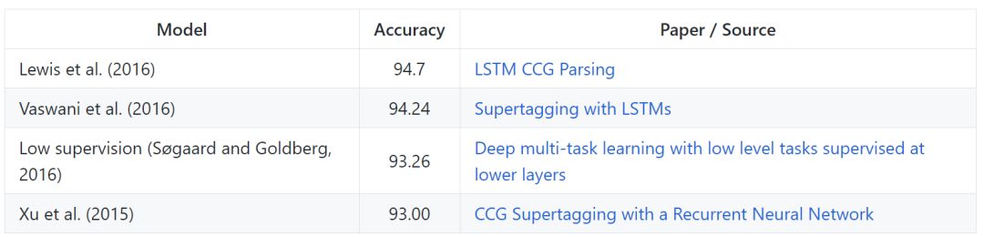 CCGBank 是 CCG 衍生物的语料库,以及从 Hockenmaier 和 Steedman 2007 年提出的 Penn Treebank 中提取的依存结构。第 2-21 部分用于训练,第 00 部分用于开发,第 23 部分用作域内测试集。其性能仅在 425 个最常用的标签上计算。模型基于准确率来评估。