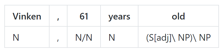 组合范畴语法(CCG; Steedman, 2000)是一种高度词汇化的形式主义。Clark 和 Curran 2007 年提出的标准解析模型使用了超过 400 个词汇语类(或超级标记(supertag)),典型的解析器通常只包含大约 50 个词性标注。