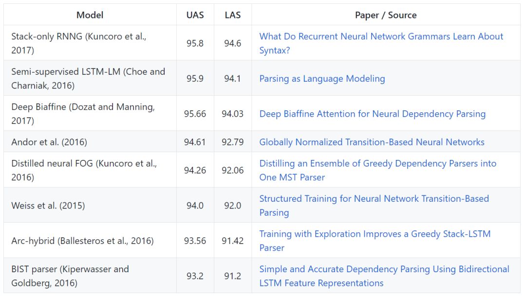 模型在《Stanford typed dependencies manual》中提出的 Penn Treebank 的 Stanford Dependency 变换和预测词类标记上进行评估。评估指标是未标记依附分数(unlabeled attachment score,UAS)和标记依附分数(LAS)。