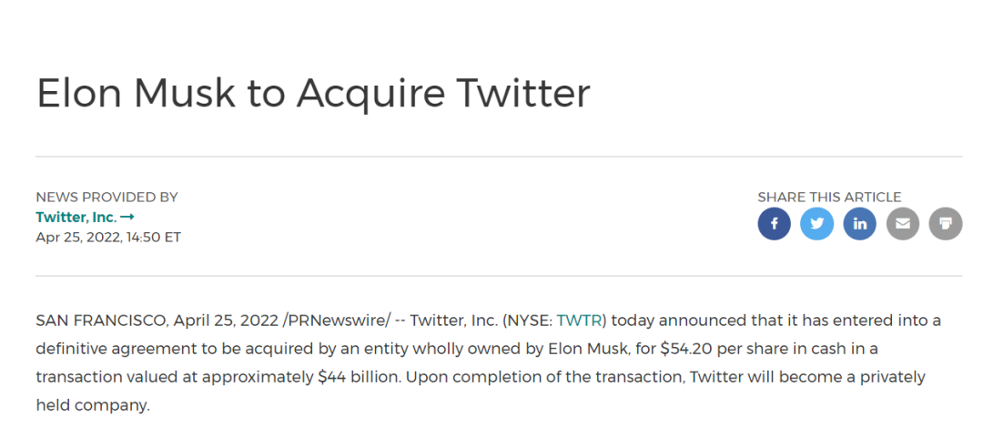 【推特与马斯克达成440亿美元收购协议】