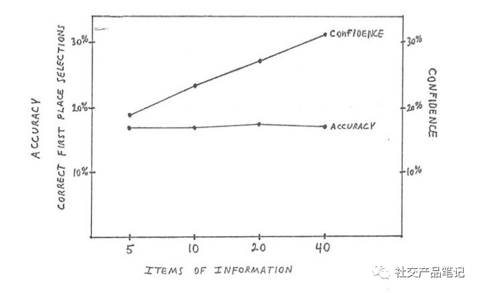随着更多的信息被添加进来,这项研究的关键部分出现了;每个赛马手被允许挑选越来越多的数据,当他们这样做的时候,他们对自己预测的信心增加了,而他们的实际结果却大致保持不变。