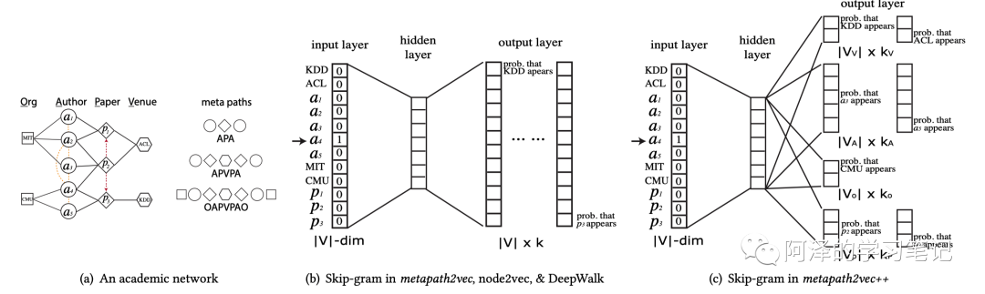 为了对异构网络节点中的邻居进行建模,metapath2vec 引入了异构 skip-gram 模型。此外,为了捕获异构网络的结构,作者还提出了基于元路径的随机游走策略。