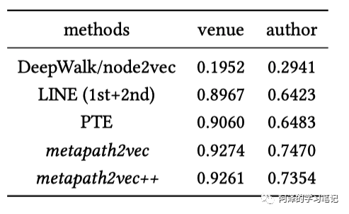 此外,作者还提出了 Metapath2Vec++ 方法,针对每种类型的节点进行单独归一化,即把异构网络分解成不同的同构网络。