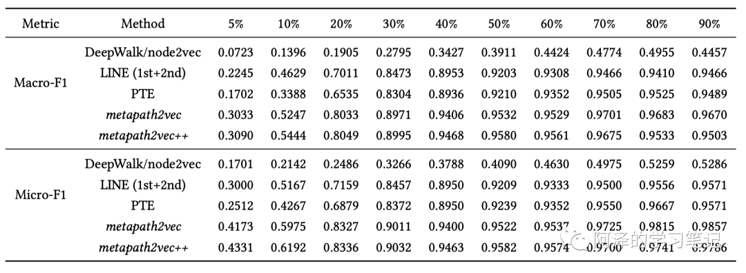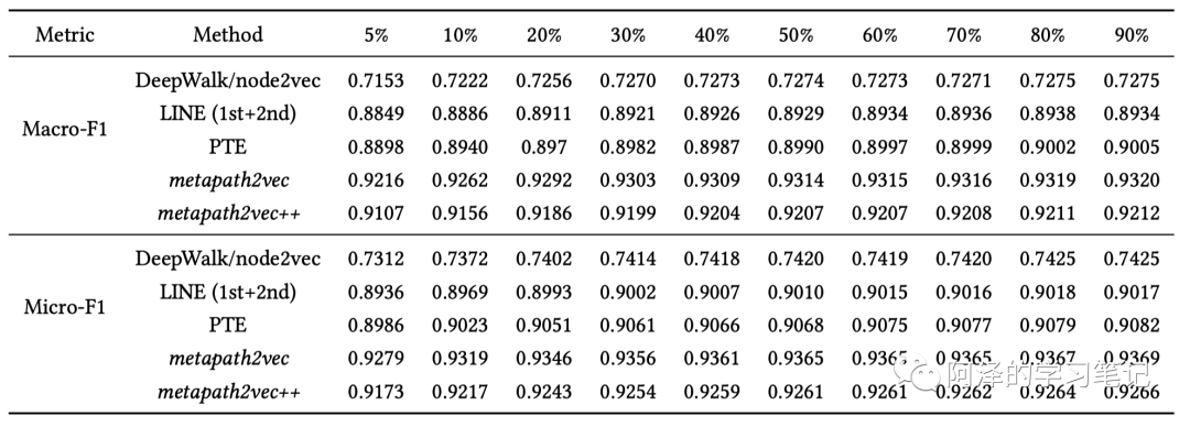 以 Aminer 数据集为例,“会议”节点节点分类的结果:(百分号为训练的数据集的占比)