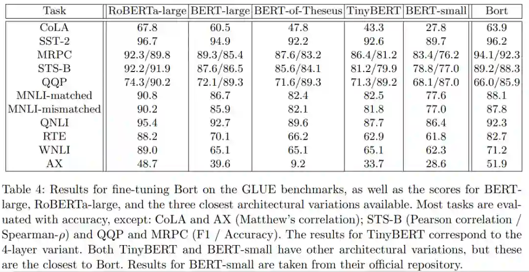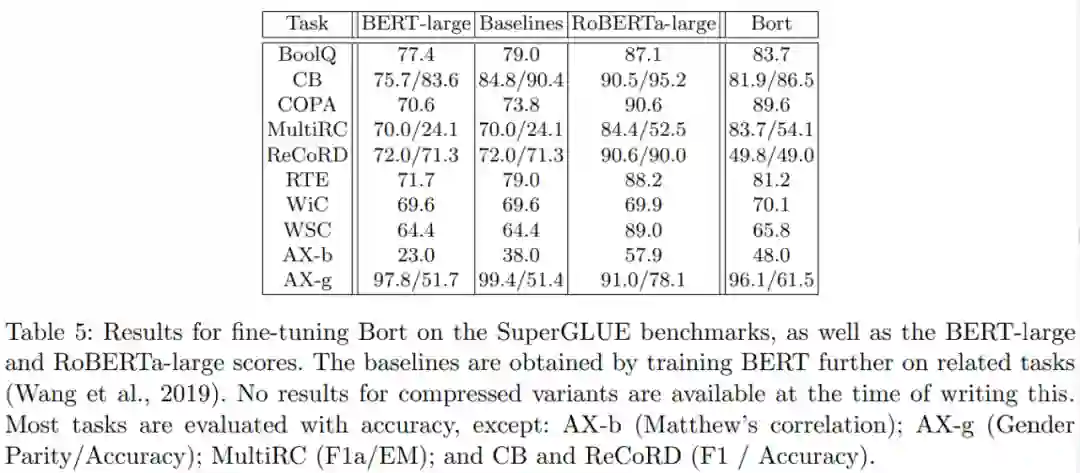 Bort 获得了良好的结果,在两个任务上都比 BERT-large 的性能高出 9-10%