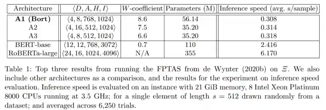 尽管 FPTAS 可以确保找到表现最优的架构,但它返回的是在上述三个指标上表现最优的架构参数集,而不会输出一个训练到收敛的架构。因此,研究者对 Bort 进行了预训练,发现与原先的训练相比,预训练速度有了明显的提高:在相同的 GPU、数据集大小也相当的情况下,Bort 训练了 288 小时,BERT-large 训练了 1153 小时,而 RoBERTa-large 训练了 24,576 小时。