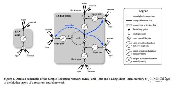 为了加强这种“记忆能力”,人们开发各种各样的变形体,如非常著名的Long Short-term Memory(LSTM),用于解决“长期及远距离的依赖关系”。如下图所示,左边的小图是最简单版本的循环网络,而右边是人们为了增强记忆能力而开发的LSTM。