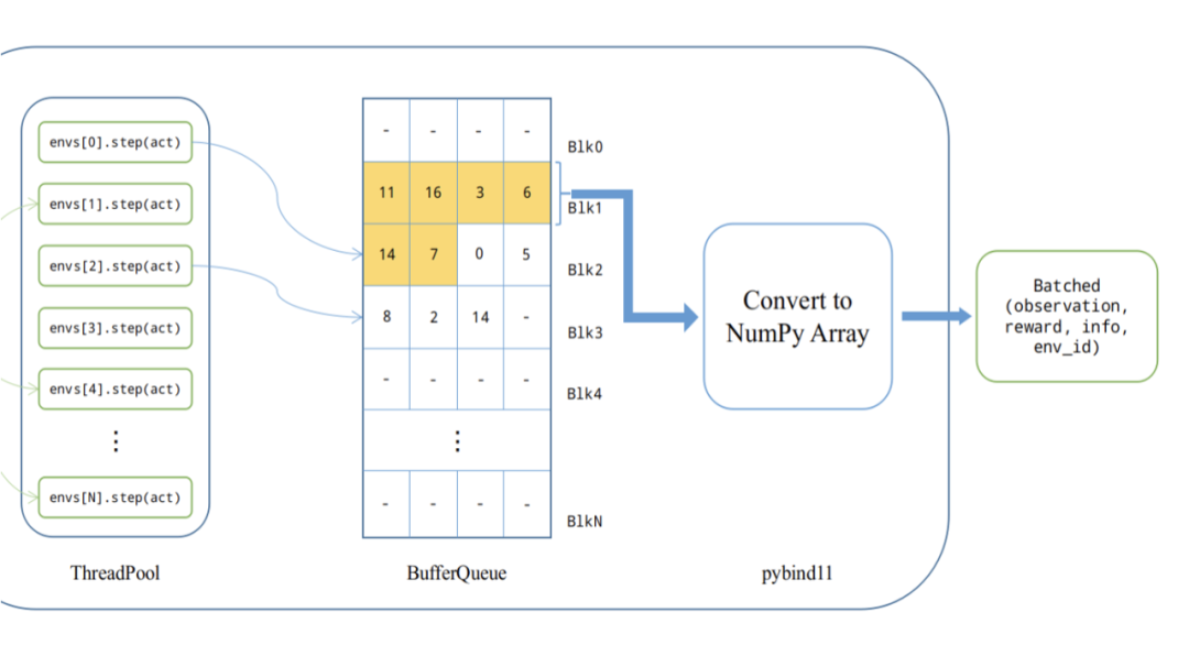 。send 函数负责将 action 放入事件队列,不等待结果便直接返回。线程池取 action 之后 step 相应的环境,结束后将 state 放入返回队列。recv 函数则从返回队列中取结果。send 和 recv 甚至可以在不同的线程中执行。