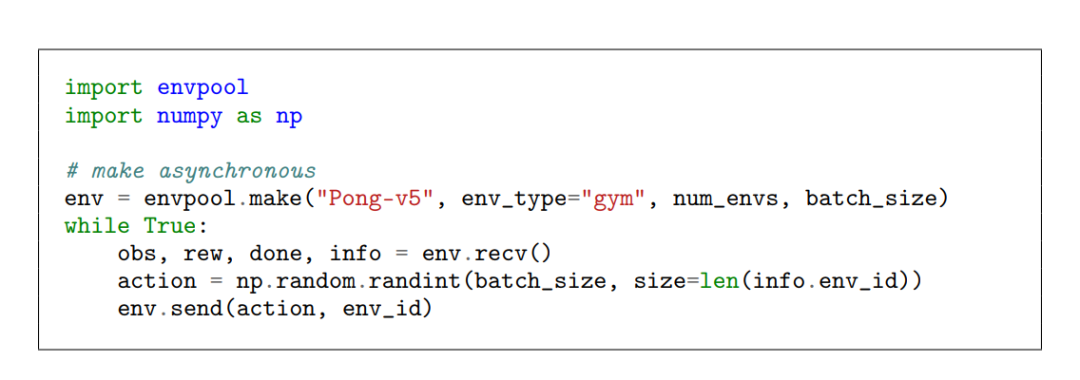 ,分别是 env.recv() 负责接收异步执行的环境里已经执行完成的 batch_size 个环境的输出,而 agent 执行完后得到的一个 batch 的 action 则通过 env.send() 函数送回 EnvPool 对应的 env_id 中。