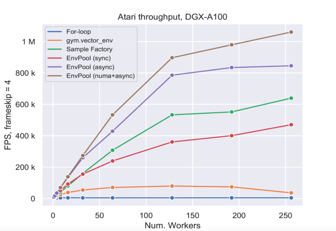 Sea AI Lab团队提出一个全新的环境模拟并行执行部件 EnvPool,使用 C++ 的线程池来异步执行 RL 环境,把 Python wrappers 整合到高速的 C++ 实现中