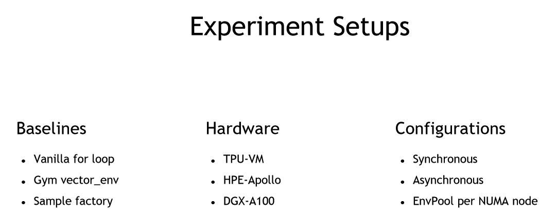 Sea AI Lab 团队在不同的硬件机器上对比了 EnvPool 与经典的环境并行执行引擎,比如前文提到的 gym.vector_env,及发表于 2020 年据团队所知是目前最快的 RL 环境执行引擎 Sample Factory。以下为实验设置: