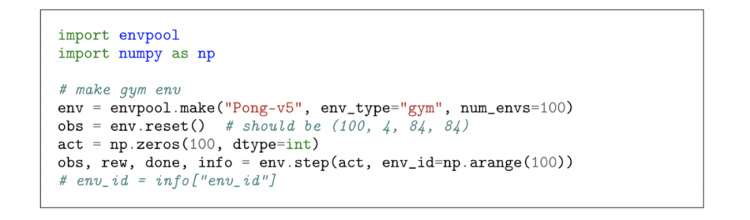 使用 C++ 定制实现的 EnvPool 对研究人员非常友好,在用户端的 Python 接口与 Gym API 接口保持一致,唯一的区别就是每一步的操作都是对一个 batch 的环境一起操作