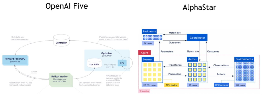 OpenAI Five(左)和 DeepMind AlphaStar 的 RL 系统。