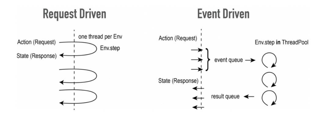 RL 环境可以类比于 web 服务。Web 服务接收用户的请求,在处理之后返回结果。而 RL 环境接收用户的 action,在处理之后返回 state。在 web 开发中,两种模式经常被提及,即事件驱动和请求驱动。