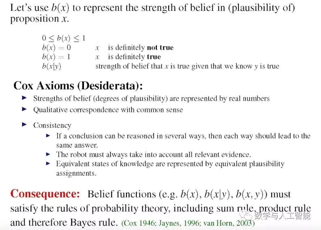 若使用 b(x) 表征命题 x 中的信念强度,那么它的取值应该在 0 到 1 之间,且只有在系统完全确信 x 会发生或完全不确信才能取到 1 和 0。此外,b(x|y) 表示在给定 y 可能会出现的信念下,x 会发生的信念强度。早在 1946 年,Cox Axioms 就写下了一些如何表示信念的定理。如上所示信念的强度应该由一个实数表示,信念应该与常识具有定性的一致性等等。此外,信念函数还应该满足概率定理,包括概率加法、乘法和贝叶斯法则。