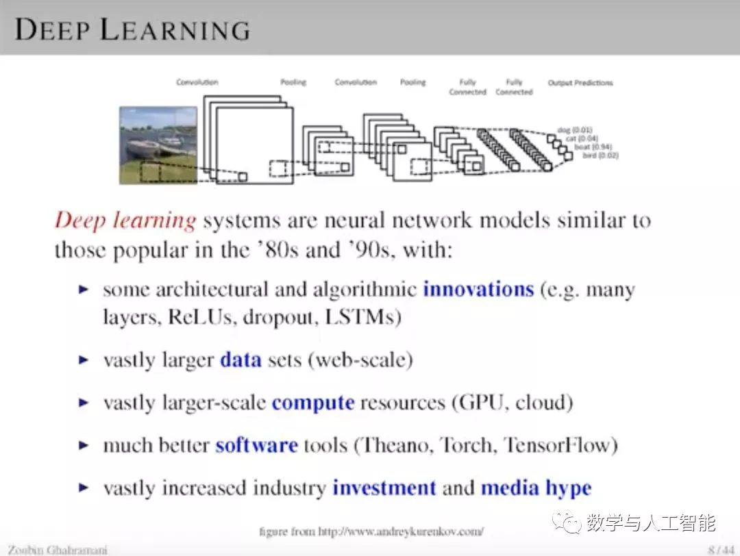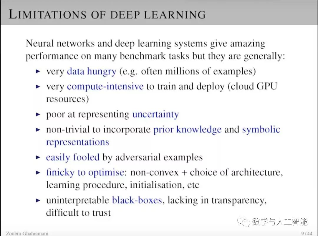 在这一个视频中,Zoubin 并不会介绍全部领域,他只会重点讨论三个方向,即贝叶斯深度学习、概率编程和自动化统计学。首先对于贝叶斯深度学习,他表示前面很多地方都将深度学习与贝叶斯统计立在对立面,但其实它们并不是对立的。深度学习旨在构建不同类型的模型,而贝叶斯推断旨在关注学习的方法,它们是可以相互结合的。
