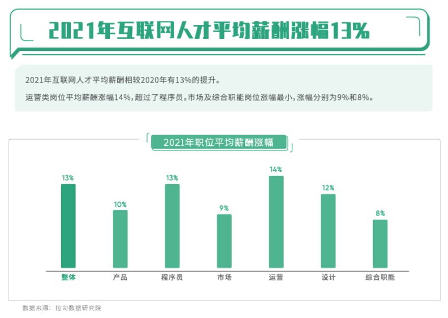 其次,运营具有“一低两高”的特点,门槛低、薪资高、发展天花板高。随着当前产品同质化严重,运营的作用也越来越受到重视,不论是互联网企业,还是传统企业,对运营人才的招聘需求逐步上升。根据《2021互联网人才招聘白皮书 》,运营岗在互联网所有岗位中的薪资涨幅排名第一,远超产品经理、程序员、市场、设计等其他岗位。