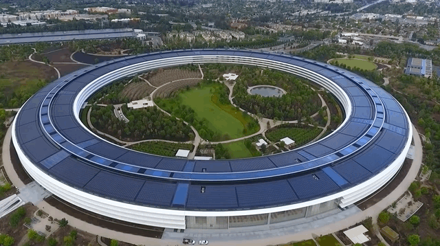 这个看似像一座飞船的大楼位于加利福尼亚库比蒂诺市,是由乔布斯生前设计,占地面积280万平方英尺(约合26万平方米)。
