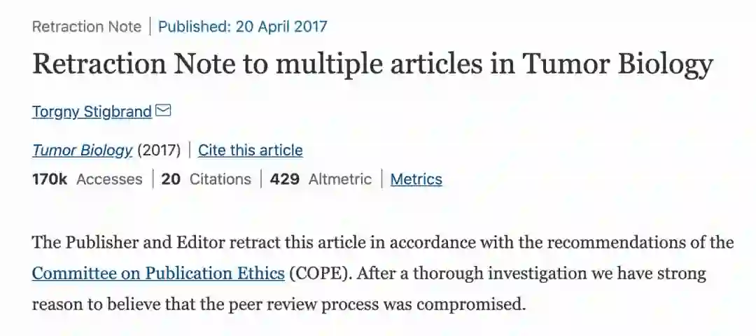 2017 年,施普林格出版集团旗下期刊 Tumor Biology 宣布一次性撤回 107 篇发表于 2012 年至 2016 年的来自中国的医学论文,撤稿原因是论文作者通过「第三方」中介投稿,伪造虚假同行评审。