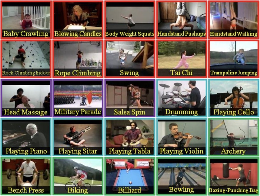 UCF101 数据集是 UCF50 的扩展,由 13,320 个视频片段组成,分为 101 个类别。这 101 个类别可分为 5 种类型(身体运动、人与人互动、人与物体互动、演奏乐器和运动)。这些视频剪辑的总长度超过 27 小时。所有视频均从 YouTube 收集,具有 25 FPS 的固定帧速率,分辨率为 320 × 240。