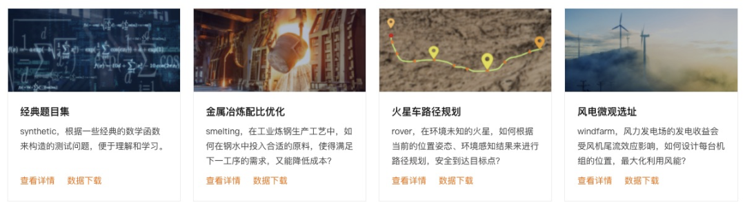 RABBO 提供了针对黑盒优化问题的数学建模和优化求解的思路,提供了黑盒优化接口规范代码、实际应用背景的测试问题、和效果评测的方案。2021 年 10 月发布的是 RABBO V1.0 版本,数据集的题目包含包含:经典题目集、金属冶炼配比优化、火星路径规划、风场微观选址。