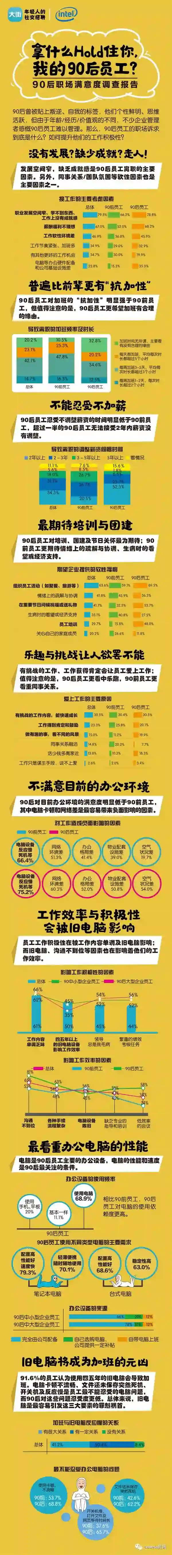 越来越多的90后进入职场,他们在就业、加班、薪酬方面有哪些特点呢?近日,Intel联合大街网发布《拿什么HOLD住你,我的90后员工?——90后职场满意度调查报告》。报告显示,对比90前员工,90后员工对于目前办公环境的满意度明显更低,其中电脑卡顿和网络差是最容易对他们的工作造成负面影响的因素。