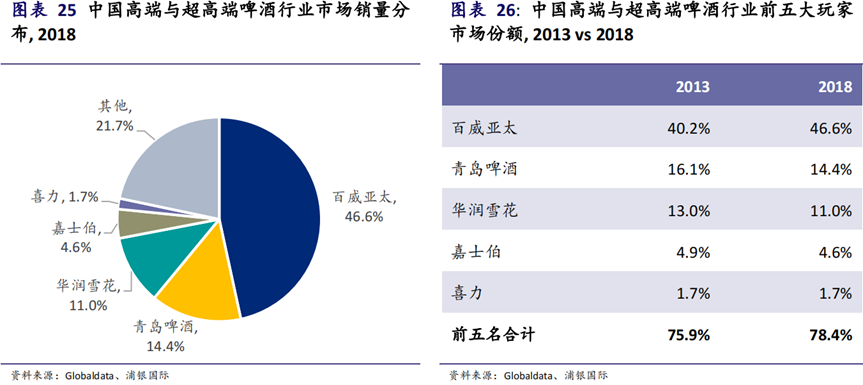 根据Globaldata的数据,百威在中国高端与超高端领域的市场份额在2018年达到46.6%,处于绝对领先的地位。随后是青岛和雪花,市场份额达10%以上。