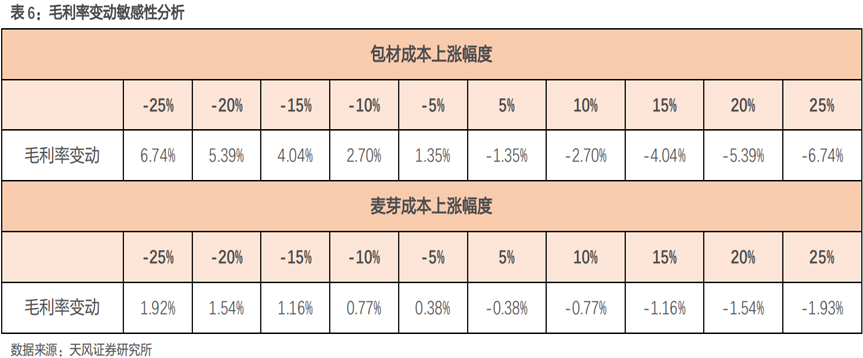 据天风证券对大麦、铝价格上涨对毛利率的预测,大麦、铝近一年来的上涨将降低啤酒行业毛利率近8%。